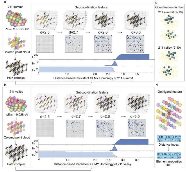 GLMY同调是由著名数学家丘成桐先生及其合作者提出的一类基于路径复形(path complex)的同调理论,能够有效刻画有向、非对称图形的整体结构特征,在处理非欧几里得空间中的结构建模任务中具有独特优势。研究团队将GLMY同调及持续GLMY同调(PGH)引入材料结构表征中,提取出反映活性位点微结构差异的拓扑不变量,并将其与元素配体信息相结合,构建了双通道的结构表示方法,分别编码局域配位效应与远场调控效应。