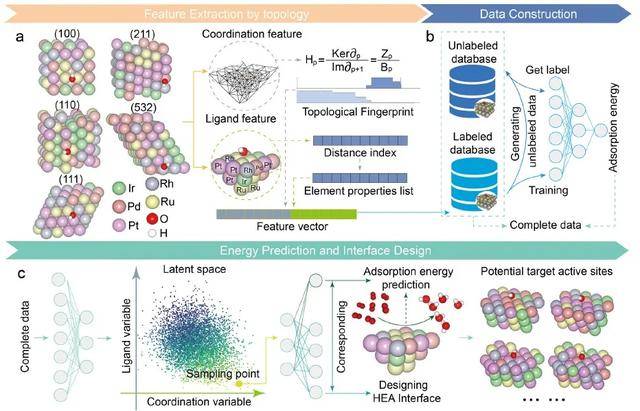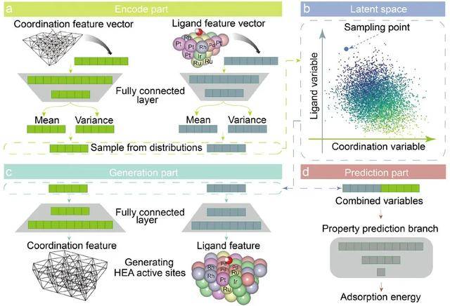 在异质催化研究中,构建具有目标吸附性能的催化活性位点是实现高效催化剂设计的核心问题之一。近年来,尽管前向设计方法结合了高通量密度泛函理论(DFT)计算与机器学习,已在揭示结构—性能关系方面取得重要进展,但要实现真正意义上的逆向设计,即从目标性能出发反推理想结构,尤其是在高熵合金(HEAs)等结构复杂体系中,仍面临显著挑战。传统模型往往难以兼顾物理可解释性、三维结构敏感性和生成能力。