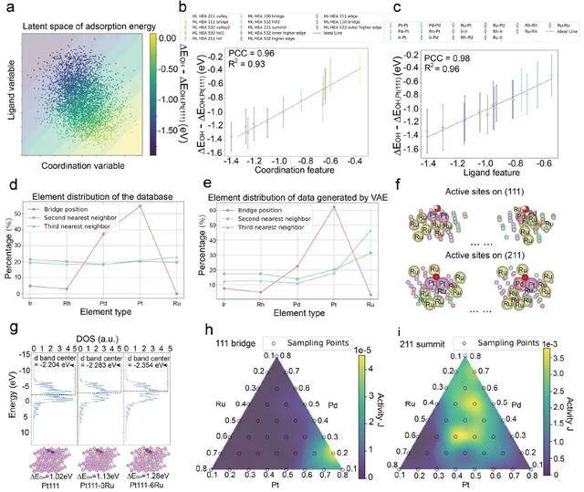 研究进一步发现,PGH拓扑特征中的Betti数与吸附性能之间具有显著的线性相关性,特别是零维与二维特征(分别对应原子连通性与局域空穴结构)对性能预测最为关键。这一发现不仅揭示了结构敏感性背后的数学机制,也提升了生成模型的物理可解释性。借助这一潜空间,模型成功生成了具有优异吸附性能的结构构型,其中以Pt/Pd为桥位、远场以Ru原子调控的三原子组合被反复识别为最优构型。进一步理论分析表明,Ru相较于Ir与Rh在调节d带中心位置方面更具优势。