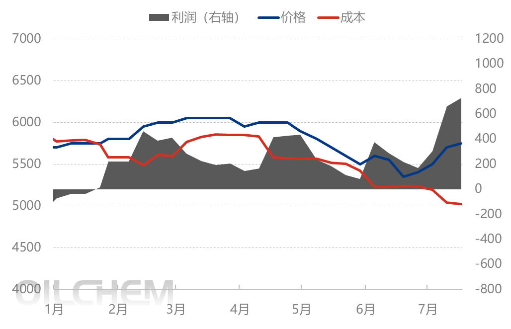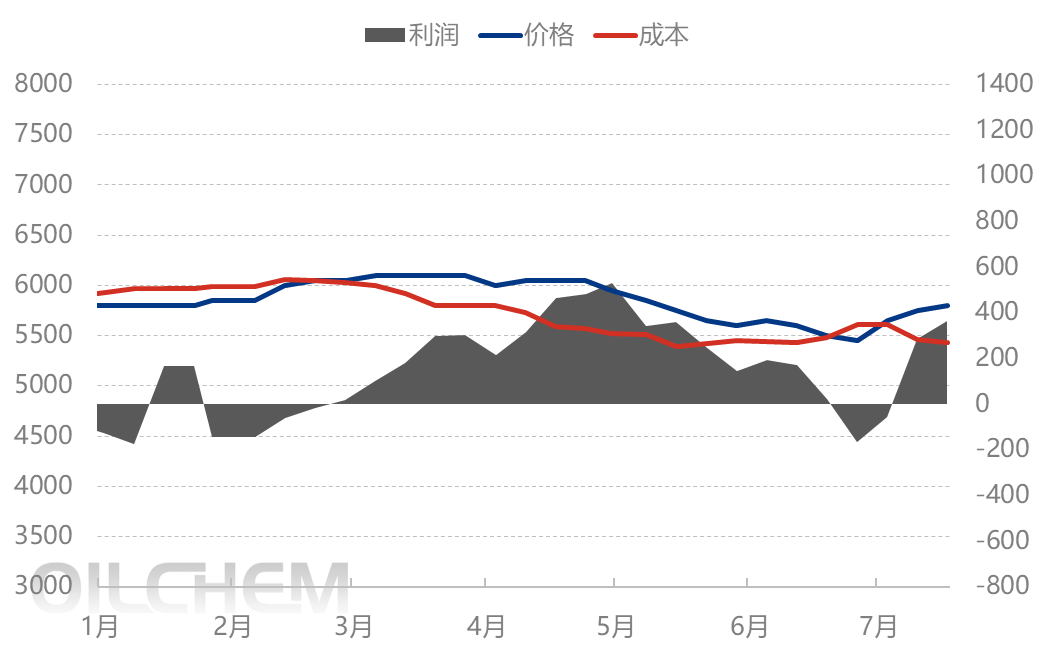 成本端来看,上游原料冰醋酸、乙烯以及电石价格均有下降,其中电石和冰醋酸价格跌至年内最低点,成本面压力减弱,随着醋酸乙烯价格不断上涨,不同工艺醋酸乙烯利润逐步增加,据隆众资讯统计,目前乙烯法利润427元/吨,电石法利润782元/吨,电石法成本优势下利润高于乙烯法,醋酸乙烯价格走势偏离成本端。
