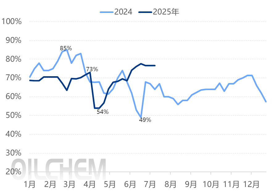 图1 2024-2025年中国醋酸乙烯产能利用率变化图(%)