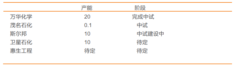 当前国内已有多家企业攻关POE技术,其中万华化学进展最快,已完成中试,预计2024年20万吨POE装置投产,除此之外,茂名石化、斯尔邦、卫星石化惠生工程都提出规划POE或已处于中试阶段,POE的国产化进程有望加快。