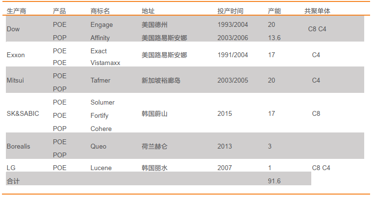 全球POE产能基本被国外企业垄断,中国尚未实现工业化应用。全球POE/POP总产能超过100万吨/年,陶氏Dow是POE领域的领导者,其产能占比最高;牌号多达20多个品种;熔指范围分布广,1-30g/10min;硏发能力强,产品质量优异。Exxon是全球最早实现POE工业化生产的企业,产能17万吨/年,除此之外,三井、 LG、SK等企业也开发了自己的催化剂体系,在POE市场中占有一席之地,POE行业集中较高。