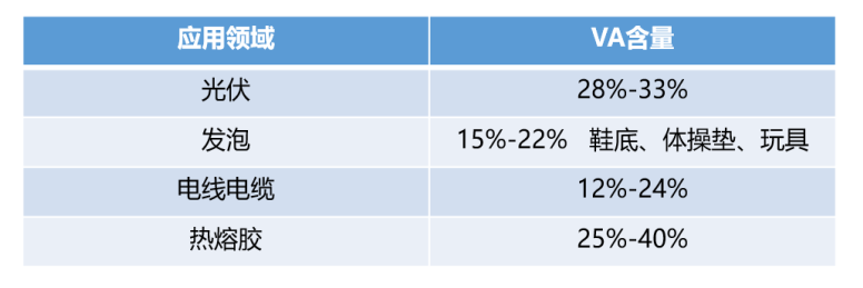 按VA含量不同,EVA可分为三大类品种:EVA树脂(VA含量5%-40%)、EVA弹性体(VA含量为40%-70%)及EVA乳液(VA含量为70%-95%),以下讨论的均为EVA树脂。