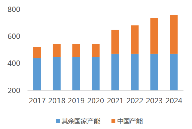 2017年-2020年,全球EVA产能增速较为缓慢,进入2021年,在碳达峰、碳中和的推动下,全球光伏产业进入新的发展阶段,EVA也迎来新的发展机遇,2021年,全球新增EVA产能达到110万吨,其中中国新产能80万吨,韩国30万吨,未来几年,全球的新产能仍将主要集中在中国,根据我们的测算,2022年-2024年,全球新增EVA产能预计达到108万吨,产能年均增速达到5.3%。