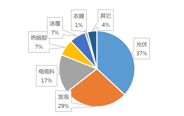 得益于光伏等行业的迅速发展,中国EVA消费量快速增长,2021年,中国EVA消费量达到205.3万吨,近5年复合增长率9.52%。EVA应用广泛,主要集中在光伏、纺织鞋材、电气等领域,下游消费结构:光伏料37%、发泡料28%、电缆料17%、热熔胶7%、涂覆7%、农膜1%,光伏料作为第一大消费下游,未来占比仍然有望扩大。