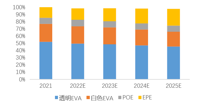 POE胶膜由于其独特的抗PID性能,同时其电阻率高、不易水解,是双玻组件的主流封装原料;EPE胶膜通过共挤工艺将EVA与POE树脂挤出制造,兼具EVA良好的加工性能与POE良好的抗PID性能、耐水汽性能。根据CPIA的预测,未来几年,透明EVA及白色EVA胶膜市场比重下滑,EPE胶膜市场份额将明显提高。